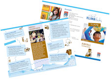 Die Flyer geben Tipps zu fünf Handlungsfeldern der nachhaltigen Entwicklung: Energie, Ernährung, Konsum, Mobilität und Biologische Vielfalt. Sie können als Aushang oder als gefalteter Flyer zur Information von Eltern verwendet werden. Dies erleichtert die Kommunikation in Bezug auf die Maßnahmen zu Klimaschutz und Bildung für nachhaltige Entwicklung (BNE) gegenüber den Eltern.