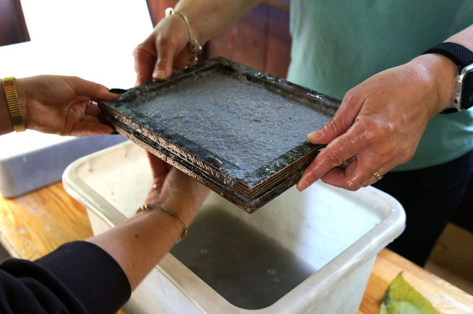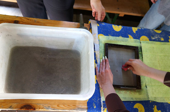 - Stürzen und Ausdrücken: Den Formrahmen abnehmen und die Pulpe auf einen Tuchlappen stürzen. Vor Abnahme des Siebrahmens überschüssiges Wasser mit Schwämmen ausdrücken und trocknen lassen. Den Siebrahmen abnehmen, ein Tuchlappen auf die Pulpe legen und mit einem Nudelholz und ein wenig Druck noch einmal alles gleichmäßig verteilen.