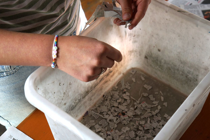 - Papier vorbereiten: Das alte Papier in kleine Stücke (etwa fingernagelgroß) reißen. Für farbiges Papier könnten auch bunte Servietten zugefügt werden.