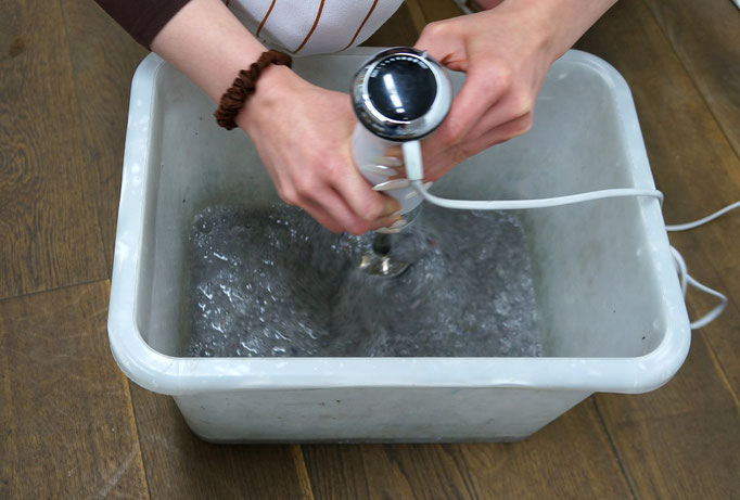 - Mixen: Das Papier-Wasser-Gemisch mit dem Mixer zu einer breiigen Masse (Pulpe) verarbeiten.