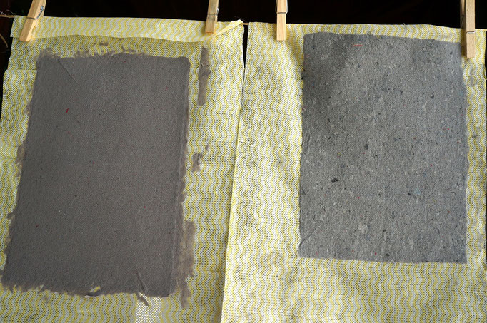 - Trocknen: Das Papier noch auf dem Tuchlappen klebend zum Trocknen aufhängen. Wenn nicht gerade sommerliches Wetter ist, dauert das über Nacht.