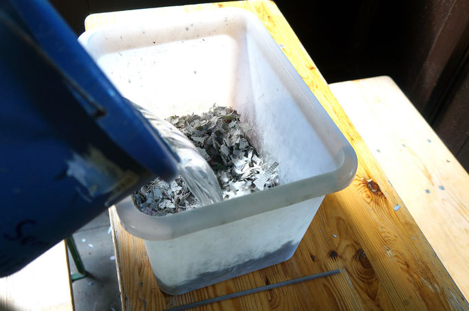 - Wasser hinzufügen: Das Wasser sollte die Papierstücke zum Einweichen vollständig bedecken. Warmes Wasser beschleunigt den Prozess etwas.